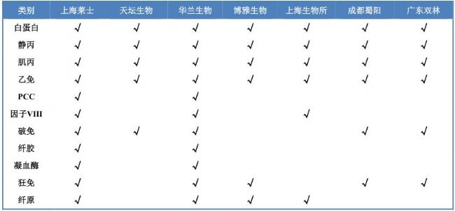 表2 國(guó)內(nèi)血液制品企業(yè)產(chǎn)品線情況