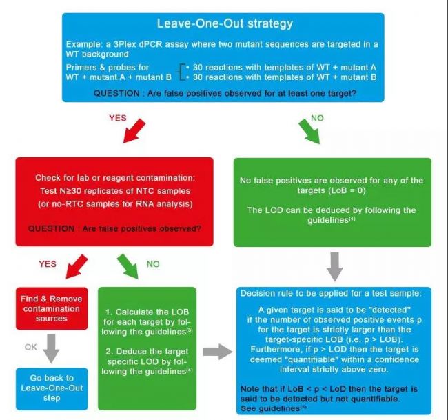在數(shù)字PCR (dPCR)中,多種因素可以引起假陽性。定量核酸時(shí)確定假陽性的cutoff對(duì)dPCR檢測(cè)的穩(wěn)定性至關(guān)重要。為了定義這個(gè)cutoff,檢測(cè)閾值通常設(shè)置在LOB值之上,而在檢測(cè)校準(zhǔn)期間必須首先為每個(gè)目標(biāo)確定空白LOB值。此外,實(shí)驗(yàn)LOB值對(duì)于判斷反應(yīng)是正還是負(fù)以及計(jì)算LOD值都是必要的。