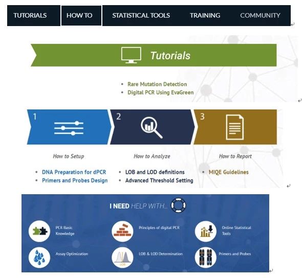 www.cycloudbio.com數(shù)字PCR學(xué)堂快速入口)統(tǒng)計(jì)工具查看,您也可以選擇其他感興趣的應(yīng)用教程,其中包含從實(shí)驗(yàn)設(shè)計(jì)到數(shù)據(jù)分析的詳細(xì)工作流程。 您還可以通過搜索導(dǎo)航工具直接搜索特定的項(xiàng)目("dPCR的DNA準(zhǔn)備","熒光溢出"等),或點(diǎn)擊我們的"HOW TO" 選擇您需要的部分(設(shè)計(jì)、分析、報(bào)告)。