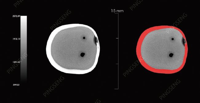 圖3:作為高密度材料的牙釉質(zhì)可直接用閾值分出。(測試樣本邊側(cè)有蛀齒發(fā)生)