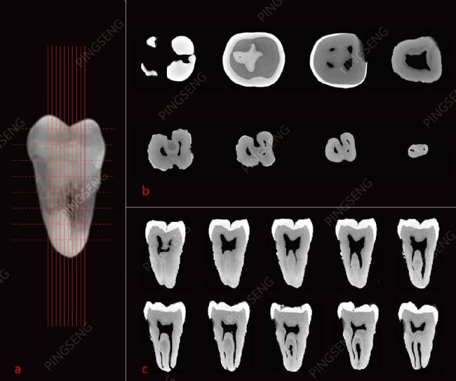 圖4:Avatar軟件還可以生成連續(xù)的切片,準(zhǔn)確可靠地顯示牙釉質(zhì),牙本質(zhì)和牙髓腔的厚度和面積。 (a.成人的真牙照片,灰度色調(diào)處理;b.橫向切片展示;c.縱向切片展示)