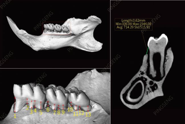 大鼠或小鼠下頜骨和臼齒在牙周病和其他牙科相關(guān)領(lǐng)域的許多研究模型中有著重要價值。通過顯微CT對動物下頜骨和牙齒的測量研究,可進一步分析牙周生物型各特征之間的相關(guān)性,為口腔美學(xué)修復(fù)、種植治療方案的選擇、治療預(yù)后的判斷以及療效的評估提供理論基礎(chǔ)