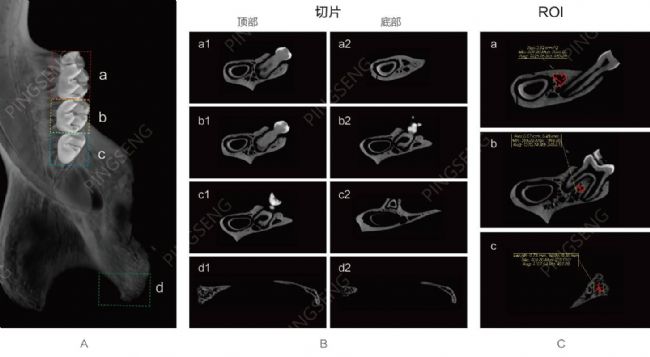 圖7: a1、b1、c1、d1分別是a區(qū)、b區(qū)、c區(qū)、d區(qū)的頂部切面,a2、b2、c2、d2分別是幾個區(qū)的底部切面;最右側(cè)圖顯示了在a、b、c 區(qū)任選一切面上,分別展示了在Avatar軟件上手繪不規(guī)則ROI、標(biāo)準(zhǔn)橢圓ROI及標(biāo)準(zhǔn)方型ROI后,可自動計算感興趣區(qū)域的尺寸及區(qū)域內(nèi)骨小梁的密度均值、標(biāo)準(zhǔn)差和最大、最小值。同時,可對感興趣區(qū)域的骨小梁的其他參數(shù)進行定量分析。