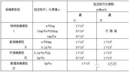 目前國家計(jì)量檢定規(guī)程規(guī)定,判斷天平是否合格,是以檢定分度值來衡量,允許誤差范圍是(0.5~1.5)e。有刻度、有輔助裝置的天平(如電子天平),檢定分度值由生產(chǎn)廠家根據(jù)準(zhǔn)確度級別表和以下規(guī)則選定: