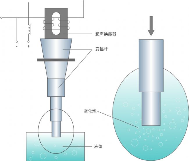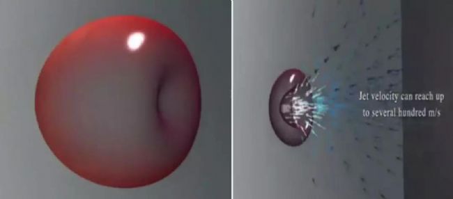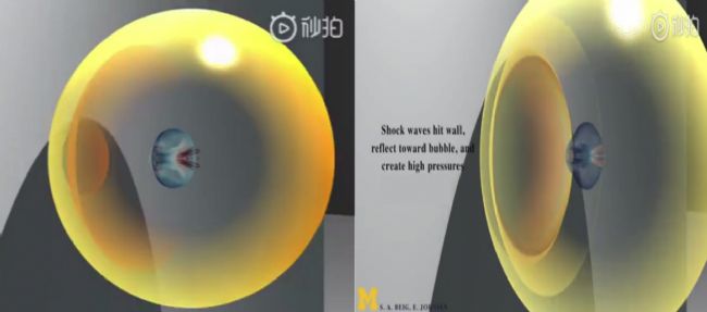 沖擊波向外呈放射狀傳播,擊中樣品固體表面,反射到氣泡,氣泡變?yōu)闇u旋向固體表面對(duì)流,產(chǎn)生巨大的瞬時(shí)壓力;這種巨大的瞬時(shí)壓力,可以使懸浮在液體中的固體顆;蛏锛(xì)胞組織表面受到急劇的破壞。