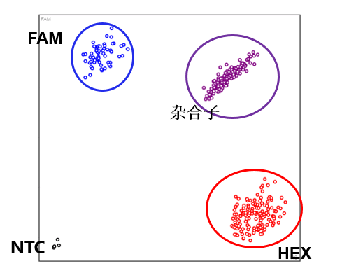 每個(gè)數(shù)據(jù)點(diǎn)代表一個(gè)獨(dú)立的DNA樣本的熒光信號(hào),相同基因型的樣本會(huì)發(fā)出相似水平的熒光,因此富集在一起。