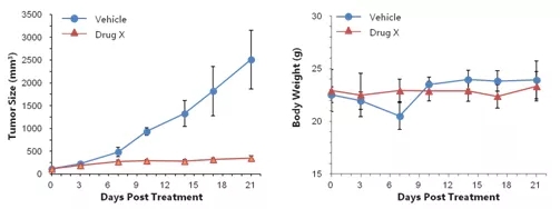 結(jié)果顯示:與對(duì)照組相比,Drug X顯著抑制了三陰乳腺癌PDX模型鼠體內(nèi)的腫瘤生長(zhǎng)。