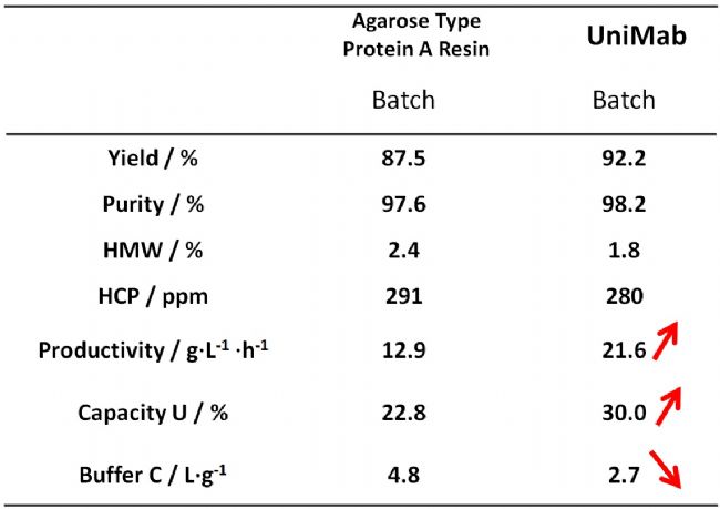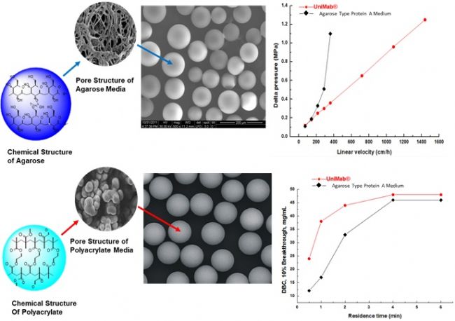 UniMab是基于單分散聚甲基丙烯酸酯多孔微球合成的,其具有高度的粒徑均勻性,且孔道穿透性好,因此抗體與Protein A 配基結合快。UniMab在高流速下(柱保留時間短)具有更高載量,因此其可以在進行工藝放大時裝更高柱床,提高抗體的批處理量和生產效率。此前有研究稱,當Protein A重復使用30次以上,流動相成本就會開始逐漸高于Protein A介質的成本,而使用UniMab可以顯著降低流動相消耗,從而降低生產成本和廢液處理的環(huán)保成本。
