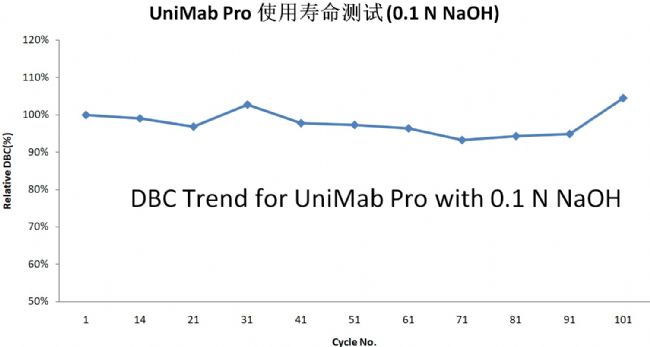 高耐堿性:耐受0.5 M NaOH溶液清洗,可以有效控制生物負荷,高效防止?jié)撛诘奈廴景l(fā)生,且在經過100 Cycles清洗后,動態(tài)載量仍要維持在95%以上;