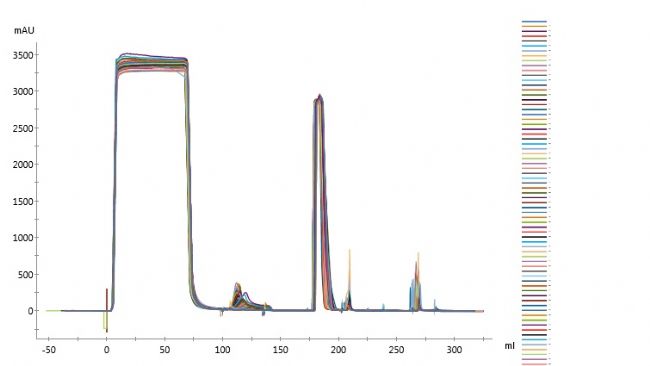 上圖是用UniMab填料進行抗體純化150次后的制備色譜圖,可以很直觀地看出多次分離純化的圖譜能夠實現(xiàn)完整得重合,可見其色譜重現(xiàn)性非常良好,不僅能夠滿足研發(fā)生產等環(huán)節(jié)的工藝要求和純化效率,而且大大降低了純化生產中變量因素的干擾,節(jié)約人力和時間成本。