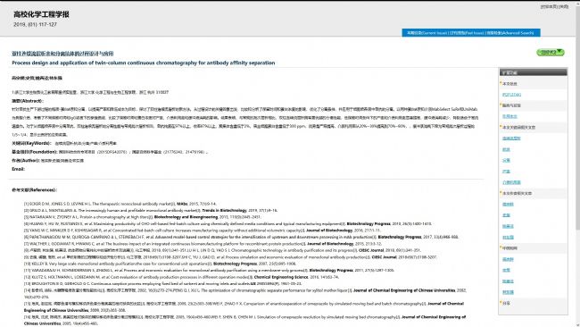 關于納微UniMab親和填料在雙柱連續(xù)流層析中的具體應用表現(xiàn),浙江大學化學工程與生物工程學院的林東強教授課題組還專門對比國際知名企業(yè)GE公司的MabSelect SuRe親和填料進行了深入研究,研究成果發(fā)表在中文核心期刊《高校化學工程學報》上,論文題為《雙柱連續(xù)流層析親和分離抗體的過程設計與應用》。林教授課題組通過認真翔實的全方面研究和數(shù)據分析,肯定了UniMab親和填料的出眾表現(xiàn),可謂是為中國色譜“芯”的國產替代提供了又一力證。在此筆者附上這篇文章的網頁預覽圖,感興趣的讀者可以點擊論文網頁圖片,即可閱讀全文。