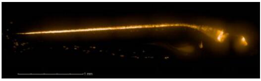 Harmony® 成像與分析軟件可以輕松檢測熒光強度,形態(tài)和紋理的變化。示例(圖4)顯示單個熒光染料可用于識別不同的身體部分。根據(jù)寬度識別頭部與脊柱。等效橢圓用于描述脊柱的形狀并估計其曲率。尾軸(圖5)以類似的方式,自動檢測尾部曲率。