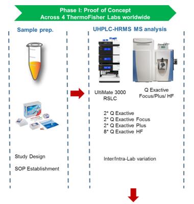 我們在Q Exactive 系列平臺上開展了一項多中心的Ring-trial。該實驗由全球5個國家和地區(qū)的14個實驗室參與,共分為2個階段: