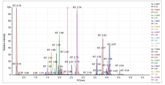 結果發(fā)現,這種方法不但增強了代謝物的保留行為,獲得良好的色譜峰形,同時靈敏度也得到了提升,下圖為41種代謝物的提取離子流圖。
