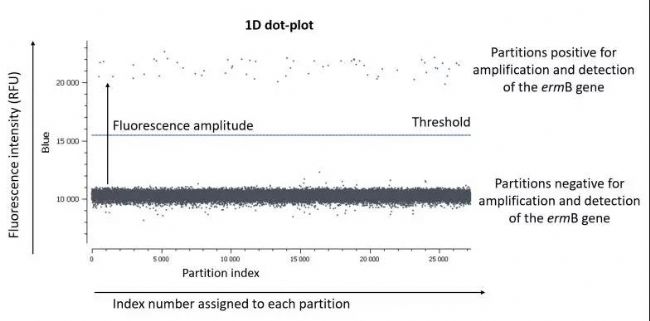 通常,閾值是由分析軟件自動(dòng)設(shè)置,閾值以上的分區(qū)為正,閾值以下的分區(qū)為負(fù)。因此,設(shè)置閾值是數(shù)字PCR對(duì)定量結(jié)果進(jìn)行處理的一個(gè)強(qiáng)制性步驟。由于閾值設(shè)置是自動(dòng)計(jì)算,我們建議您查看點(diǎn)一維圖。但是,下面兩種情況需要手動(dòng)設(shè)置閾值: