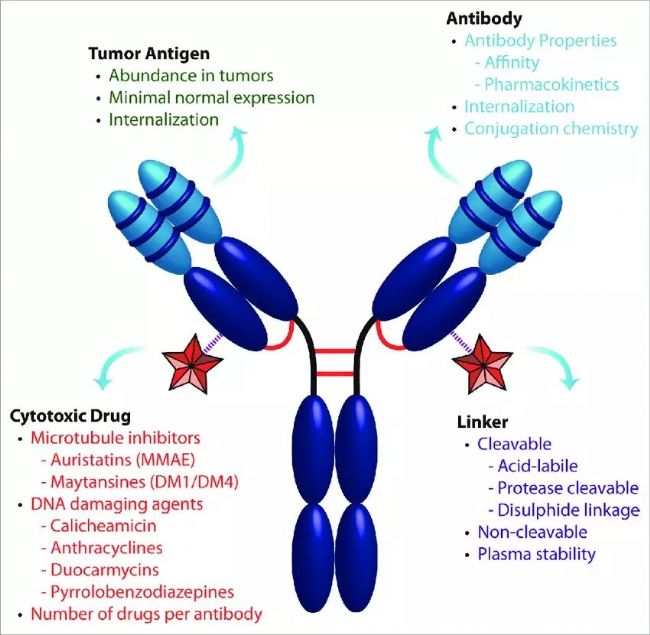 現(xiàn)在的ADC通常由一個(gè)完全人源化的單克隆抗體(mAb)、一個(gè)細(xì)胞毒藥物、一個(gè)合適的連接體和腫瘤細(xì)胞上特異性表達(dá)的抗原組成。該結(jié)構(gòu)主要保持藥物的細(xì)胞毒性、靶向性和ADC在體循環(huán)中的穩(wěn)定性。正確的選擇組合是成功研制ADC的關(guān)鍵