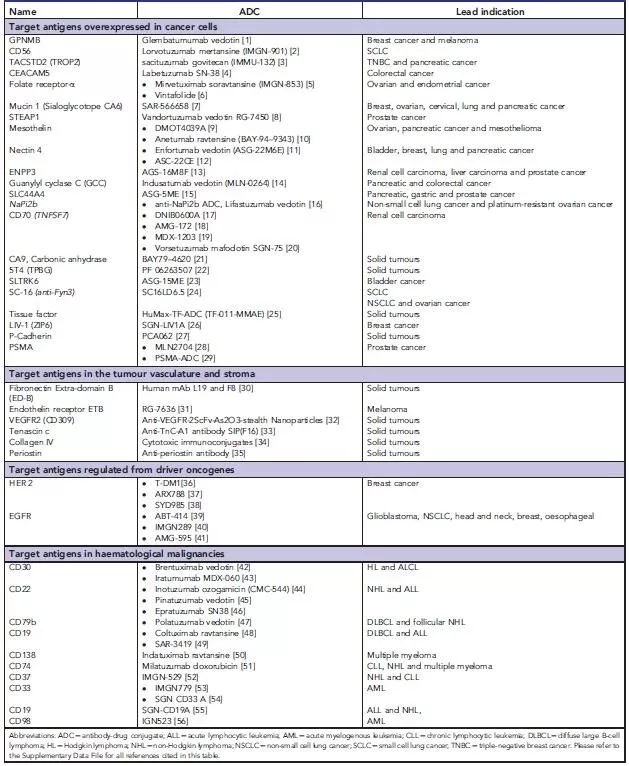 靶細(xì)胞表面抗原通常會(huì)涉及到細(xì)胞的正常生長(zhǎng)或增殖過(guò)程,一般是細(xì)胞表面蛋白、糖蛋白或多肽等。理想的抗原靶標(biāo)應(yīng)在靶細(xì)胞表面大量特異性的表達(dá),而在正常組織或細(xì)胞表面表達(dá)有限或不表達(dá),同時(shí)應(yīng)具有一定的內(nèi)吞速率以及有合適的內(nèi)吞轉(zhuǎn)運(yùn)途徑。目前在開(kāi)發(fā)的ADCs幾乎全部覆蓋已確證的靶點(diǎn),靶點(diǎn)的確定也基本決定了ADCs藥物的適應(yīng)指征。