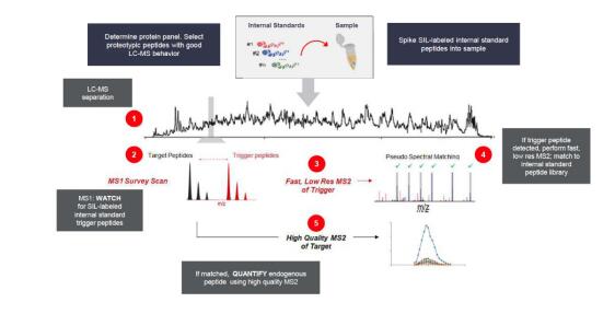 但是PRM一直受到通量問(wèn)題的困擾,即使采用動(dòng)態(tài)保留時(shí)間,也難以在一針采集中同時(shí)監(jiān)控上百條肽段。因此,在2015年Gallien等人在MCP上發(fā)表了Internal-Standard triggered PRM(IS-PRM)的方法,其核心思想為對(duì)內(nèi)標(biāo)肽段進(jìn)行一個(gè)低分辨,低離子注入時(shí)間的PRM掃描(內(nèi)標(biāo)的含量通常比較高,因此不會(huì)受到靈敏度影響),隨后在線對(duì)該P(yáng)RM掃描進(jìn)行實(shí)時(shí)譜圖檢索,若能夠匹配到目標(biāo)序列則觸發(fā)對(duì)應(yīng)內(nèi)源肽段的高分辨,高離子注入時(shí)間的PRM掃描用于定量⁽⁴⁾。該方法由于需要使用賽默飛提供的API對(duì)儀器控制軟件進(jìn)行編程修改,因此一直未能得到廣泛應(yīng)用。