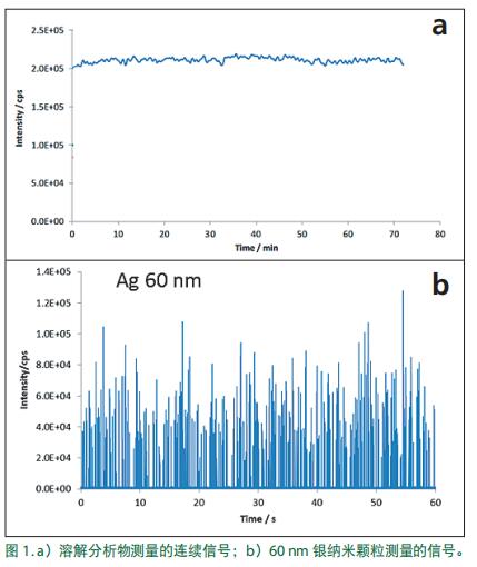 如需通過 ICP-MS 有效地檢測和測量單納米顆粒,則需以不同于溶解樣品分析時(shí)的方式操作儀器。溶解樣品和單納米顆粒分析的響應(yīng)信號如圖 1 所示。在圖 1a 中,穩(wěn)態(tài)信號來自于溶解元素的測量;檢測單顆粒時(shí)的信號呈現(xiàn)脈沖狀,如圖 1b 中 60 nm 銀顆粒檢測信號所示。在圖 1b 中,每個(gè)峰代表一個(gè)顆粒。數(shù)據(jù)采集方式的差異是理解單顆粒分析的關(guān)鍵,要理解這部分內(nèi)容,最為簡單的方法就是分析與比較溶解態(tài)元素和顆粒測量時(shí)所涉及的流程。