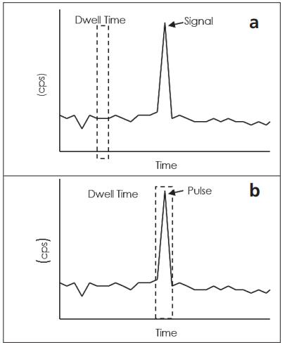 在測量溶解態(tài)元素時(shí),氣溶膠進(jìn)入等離子體,液滴得到去溶劑化與電離化。產(chǎn)生的離子進(jìn)入四極桿,通過其質(zhì)荷比(m/z)進(jìn)行分辨。四極桿在各質(zhì)荷比(m/z)停留一段時(shí)間,然后移動到下一質(zhì)荷比(m/z);各質(zhì)荷比(m/z)的分析時(shí)間被稱作“駐留時(shí)間”。在各駐留時(shí)間的測量完成之后,執(zhí)行下一次測量之前,通過一定時(shí)間進(jìn)行電子器件的穩(wěn)定。該時(shí)間段被稱作“穩(wěn)定時(shí)間”,即暫停和處理時(shí)間。在分析溶解態(tài)元素時(shí),產(chǎn)生的信號基本上屬于穩(wěn)態(tài)信號,如圖 2a 所示。然而,考慮到駐留時(shí)間和穩(wěn)定時(shí)間,由于存在電子器件的穩(wěn)定時(shí)間,因此檢測信號其實(shí)是不連續(xù)的,而這是納米顆粒分析時(shí)的一個(gè)關(guān)鍵點(diǎn)(圖 2b)。