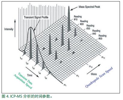 圖 4 顯示的是 ICP-MS 分析中涉及的時(shí)間參數(shù)。三個(gè)坐 標(biāo)軸分別代表信號強(qiáng)度、質(zhì)荷比(m/z)和時(shí)間。對于常規(guī) / 溶解態(tài)分析,質(zhì)荷比軸和信號強(qiáng)度軸的重要性最高:所得出的譜圖是 m/z 與信號強(qiáng)度的圖表。在考慮四極桿從質(zhì)荷比到質(zhì)荷比的移動速度時(shí),時(shí)間軸具有重要意義,而此參數(shù)被稱為“四極桿掃描速度”。在測量瞬態(tài)信號的多個(gè)元素(如激光燒蝕和多元素形態(tài)分析)時(shí),四極桿掃描速度具有重要作用。
