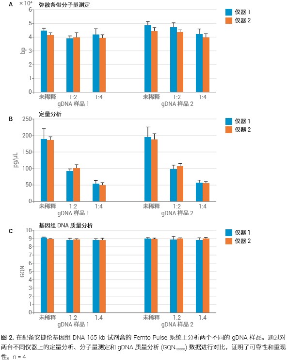 在配備安捷倫基因組 DNA 165 kb 試劑盒的 Femto Pulse 系統(tǒng)上分析兩種不同的 gDNA 樣品。在兩臺不同的 Femto Pulse 儀器上對幾種濃度下的兩個樣品進(jìn)行了分析,以證明較大濃度范圍內(nèi)不同儀器之間的分子量測定、濃度定量和 gDNA 質(zhì)量分析的可靠性與一致性(圖 2)。每臺儀器各稀釋比例的分子量測定和定量分析精度(誤差)分別低于 8% 和 16%,均處于試劑盒的規(guī)格范圍內(nèi)。此外,GQN 證明儀器有極高精度,CV 為 3%。