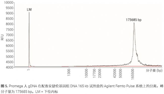 [3]。在 ProSize 中,將其報告為峰分子量。在用凝膠電泳評估 DNA 完整性時,CFL 是常規(guī)報告參數(shù)。CFL 的減少變化容易檢出,并可作為物理剪切引起降解的指標(biāo)。在配備安捷倫基因組DNA 165 kb 試劑盒的 Femto Pulse 系統(tǒng)上分析 Promega 人 gDNA。電泳圖顯示出 175685 bp 的尖峰,對應(yīng)為樣品的 CFL(圖 5)。并非所有樣品都能顯示出明確的 CFL,如圖 1 所示。在這種情況下,可以利用平均分子量的變化追蹤降解,而不是用最大豐度峰分子量或CFL。