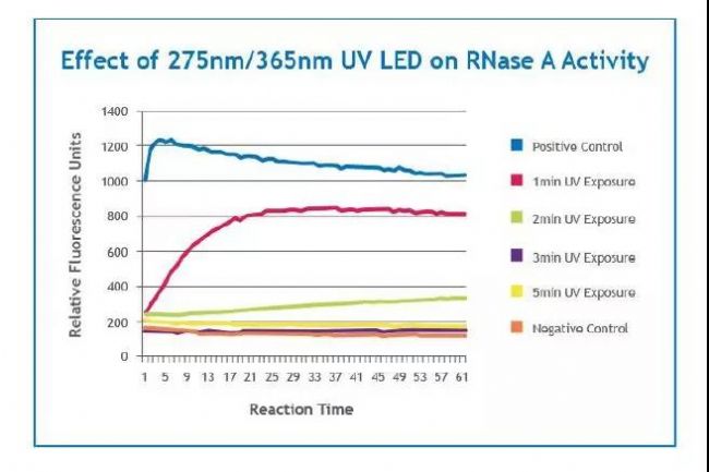 我們?cè)诖藞?bào)告使用高輻照度UV LED光引擎使酶失活。結(jié)果表明,輻照度(強(qiáng)度)和輻射通量(劑量)均可使RNase A酶快速失活。在275nm的紫外光被認(rèn)為是對(duì)RNase A的芳香氨基酸的二硫鍵產(chǎn)生影響。365 nm波長(zhǎng)針對(duì)賴氨酸側(cè)鏈,目的是破壞RNase A反應(yīng)袋的穩(wěn)定性。這兩種波長(zhǎng)協(xié)同作用,使RNase A快速失活。我們認(rèn)為,高強(qiáng)度UV LED輻照是一種新穎、快速的方法。
