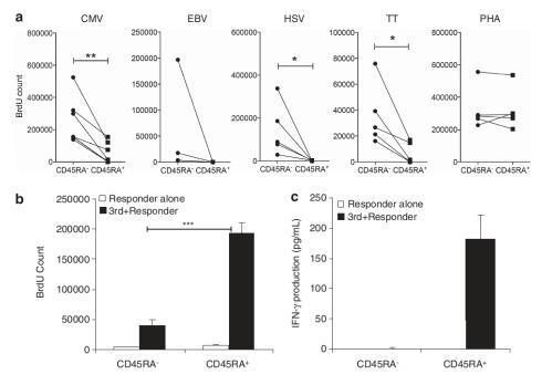 由于CD45RA-細(xì)胞主要為CD3+CD45O+記憶T細(xì)胞,因此針對常見的病原體和疫苗應(yīng)有更好的回憶應(yīng)答(Recall response)。通過使用DELFIA Cell Proliferation Assay 檢測摻入的BrdU,研究確認(rèn)CD45RA- T細(xì)胞對人CMV、Epstein–Barr 病毒、 herpes simplex 病毒和tetanus toxoid有更為顯著的免疫反應(yīng)(下圖a,增殖指標(biāo));谕瑯拥脑鲋硻z測平臺,研究利用PBMC開展Mixed lymphocyte reaction (MLR),對比不同細(xì)胞亞群的同種異體反應(yīng)。相較于CDRA-效應(yīng)細(xì)胞群體,CD45RA+細(xì)胞在MLR實(shí)驗(yàn)中具有更高的增殖能力(下圖b)和IFN-γ分泌能力(下圖c)[3]。