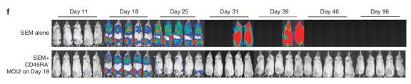 進(jìn)一步的體內(nèi)實(shí)驗(yàn)研究繼續(xù)利用了PerkinElmer IVIS活體成像平臺,在白血病小鼠模型的基礎(chǔ)上,研究證明CD45RA-的 CAR-T療法在不誘導(dǎo)GVHD的同時,發(fā)揮強(qiáng)效的抗癌效果[3]。借助活體成像的優(yōu)勢,研究追蹤CD19+ SEM細(xì)胞在小鼠體內(nèi)的擴(kuò)增情況,確認(rèn)在接種18天后腫瘤的信號強(qiáng)度足以模擬頑固性白血病小鼠模型。在此模型的基礎(chǔ)上CD45RA-的 CAR-T療法同樣能迅速發(fā)揮作用,兩周內(nèi)強(qiáng)力抑制生物發(fā)光信號至檢測限以下。最后,基于同樣的檢測平臺結(jié)合重復(fù)接種腫瘤細(xì)胞,研究證明CD45RA-的 CAR-T療法還能作用于復(fù)發(fā)白血病小鼠模型。