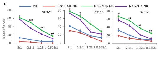 在6月份的Molecular Therapy期刊上,廣州醫(yī)科大學(xué)附屬第三醫(yī)院的研究向我們展示了最新的CAR-NK臨床應(yīng)用。為了特異靶向腫瘤細(xì)胞表面抗原NKG2DLs,研究在NKG2D受體的胞外結(jié)構(gòu)域基礎(chǔ)上融合參與NK細(xì)胞活化的核心分子DAP12,并進(jìn)一步通過RNA轉(zhuǎn)染途徑提升CAR-NK安全性;DELFIA的細(xì)胞殺傷檢測法,研究證明NKG2D-DAP12 (NKG2Dp)能有效的裂解多種腫瘤細(xì)胞系,優(yōu)于對照NK和NKG2D-CD3z(NKG2Dz)[4]。