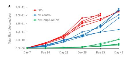 借助Perkinelmer提供的HCT116-luc報(bào)告細(xì)胞系,研究通過活體成像方法,在體內(nèi)水平證明CAR-NK能有效控制腫瘤發(fā)展。進(jìn)一步的臨床研究證明CAR-NK的引入能迅速引起腫瘤退縮和腫瘤細(xì)胞減少,強(qiáng)調(diào)NKG2D CAR是一種很有前景的細(xì)胞治療方案[4]。