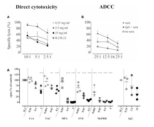 除了直接殺傷靶細(xì)胞外,抗體依賴的細(xì)胞介導(dǎo)的細(xì)胞毒性作用(Antibody-dependent cell-mediated cytotoxicity,ADCC)也是評價(jià)NK細(xì)胞功能的一個關(guān)鍵指標(biāo)。在今年的一份研究中,DELFIA細(xì)胞毒法被用于衡量靜脈注射免疫球蛋白( intravenous immunoglobulin, IVIG)對NK細(xì)胞功能的影響。從結(jié)果可以看出,除了阻斷NK細(xì)胞的直接殺傷能力外,IVIG幾乎完全抑制ADCC活力(下圖上)[8]。在該研究中,除了ADCC檢測外,Perkinelmer的放射檢測解決方案(3 [H]-Thymidine和MicroBeta 2)也被用于衡量IVIG和免疫抑制藥物對NK細(xì)胞增殖的影響。H3-摻入法證明相較于IVIG,免疫抑制藥物能有效抑制NK細(xì)胞增殖(下圖下),而IVIG則特異作用于T細(xì)胞活力。鑒于ADCC是單抗藥物發(fā)揮臨床效果的核心機(jī)制之一,其活力檢測也成為大分子藥物研發(fā)的必須環(huán)節(jié)[9]。