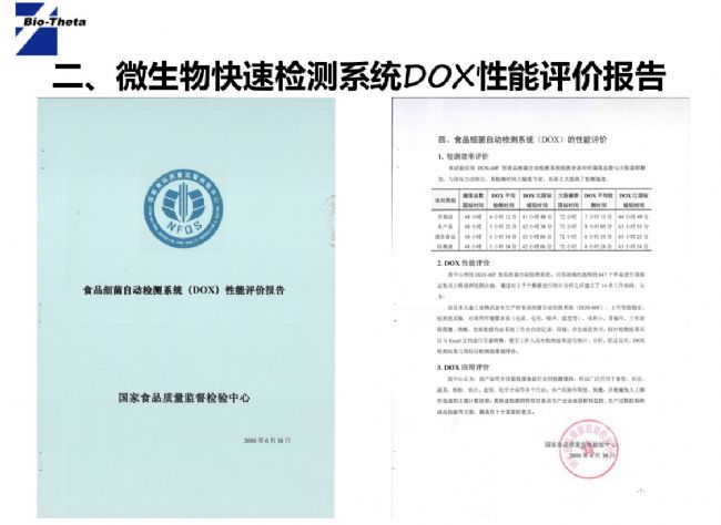 4)國家食品質(zhì)量監(jiān)督檢驗中心2006年6月隨機選購樣品進行菌落總數(shù)及大腸菌群檢測實驗,經(jīng)過比對,DOX檢測結(jié)果與國標法檢測結(jié)果相符合。國家食品檢驗中心主要從性能,應(yīng)用,檢驗效率三個方面對DOX給與了充分肯定和高度的評價。
