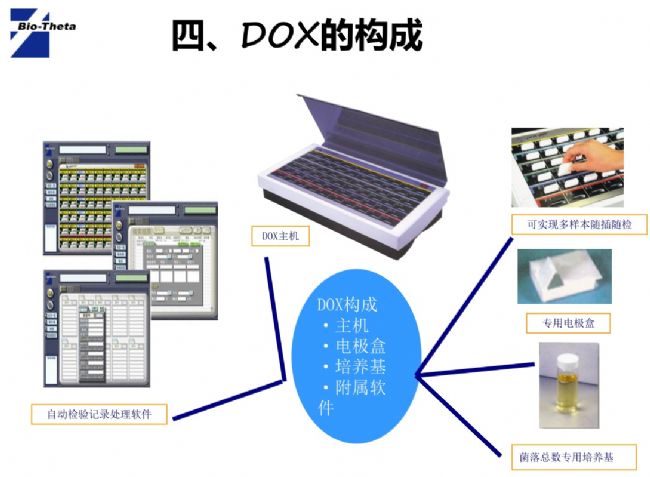 全自動微生物快速檢測系統(tǒng)(DOX)包括能夠自動監(jiān)測、自動判斷、自動記錄的檢測系統(tǒng)和簡單方便的附屬軟件。其具體