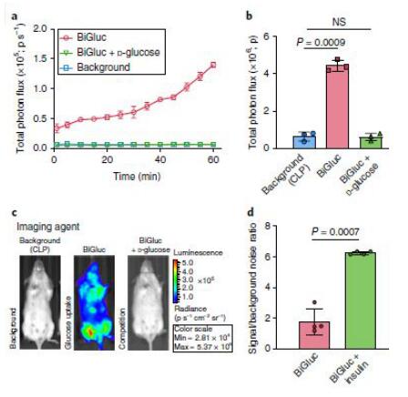 為了進(jìn)一步研究BiGluc和d-葡萄糖的在體內(nèi)的選擇性,作者進(jìn)行了胰島素耐受性試驗(yàn)。高水平的胰島素會(huì)導(dǎo)致GLUT4易位到細(xì)胞膜,隨后組織對(duì)d-葡萄糖攝取的增加。因此實(shí)驗(yàn)中FVB-luc+/+小鼠靜脈注射CLP,24h后注射GAz4 結(jié)合 PBS溶液(對(duì)照組)或者胰島素,隨后進(jìn)行生物發(fā)光成像,結(jié)果顯示胰島素處理組小鼠的信號(hào)增加了三倍(下圖d)。