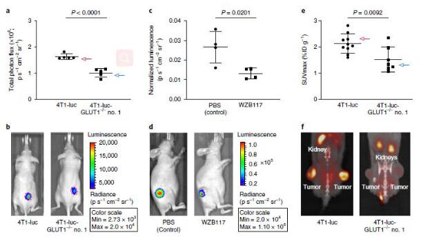 如前所示,進(jìn)行BiGluc探針成像實(shí)驗(yàn)。實(shí)驗(yàn)結(jié)果表明,與對(duì)照組相比,4T1-luc-GLUT1−/−發(fā)光強(qiáng)度降低38%。同樣文中還研究了BiGluc信號(hào)是否可以通過化學(xué)抑制GLUT1轉(zhuǎn)運(yùn)體來(lái)調(diào)節(jié)。眾所周知,WZB-117是一種小分子的GLUT1可逆抑制劑,能夠在不同的癌癥中有效地阻止葡萄糖的攝取。結(jié)果顯示W(wǎng)ZB-117處理組,葡萄糖攝取信號(hào)減少50%(下圖c,d)。同樣文中比較了BiGluc 探針和18F-FDG-PET在腫瘤移植體中的應(yīng)用效果。結(jié)果顯示 4T1-luc-GLUT1−/-細(xì)胞對(duì)葡萄糖的攝取量降低,與BiGluc探針成像結(jié)果一致(下圖e,f)。