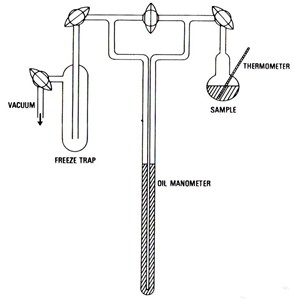 另一個(gè)早期的方法是使用壓力測(cè)量法對(duì)食品的蒸汽壓進(jìn)行直接測(cè)量。1943年Makower和Myers介紹了用于測(cè)量食品水分活度的這種技術(shù),但是它錯(cuò)誤地等同了所有水分的蒸汽壓。圖2描述了蒸汽壓測(cè)量的裝置。通過(guò)良好的技術(shù)和精確的溫度控制,這些儀器有一個(gè)相對(duì)高的精度(0.002 aw)。而且這個(gè)儀器價(jià)格相對(duì)便宜,但是使用非常滿發(fā)以及非常容易破碎。