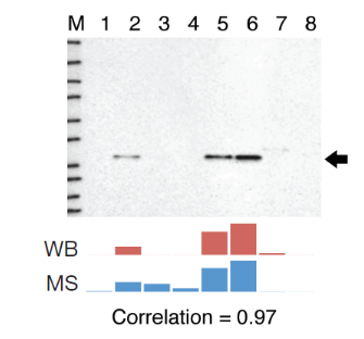 下圖比較了蛋白質(zhì)印跡和質(zhì)譜法測定蛋白表達量的相關(guān)性。通過對八種細胞系中蛋白表達量的測定,我們可以看到他們的相關(guān)性高達0.97,表明該抗體對于蛋白質(zhì)印跡分析是有效的。