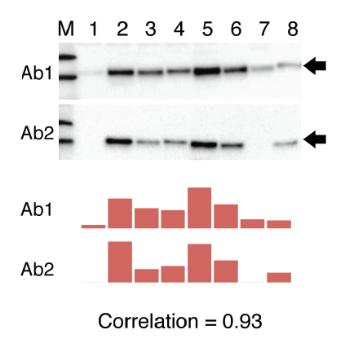 使用針對相同靶標的兩種或更多種不同抗體是測量抗體特異性的直觀且有效的方法。在相同的實驗條件中測定抗體相關(guān)性十分重要。如果抗體具有不同的抗體表位(即抗體結(jié)合抗原的不同區(qū)域)則表明該抗體是獨立的。這樣,它們不可能表現(xiàn)出脫靶效應并結(jié)合與該研究無關(guān)的同一蛋白質(zhì),這種方法可結(jié)合敲除或敲低的方法一起使用。