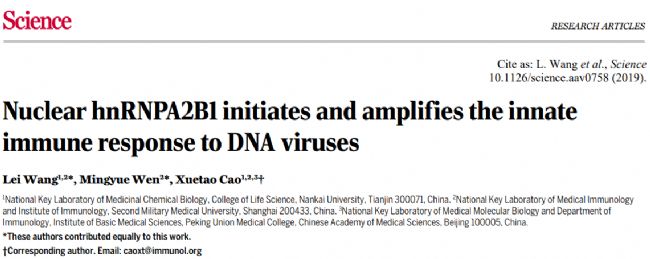 就在2019年7月18日,Science在線發(fā)表了南開大學(xué)曹雪濤院士團(tuán)隊(duì)的科研成果“Nuclear hnRNPA2B1 initiates and amplifies the innate immune response to DNA viruses”。