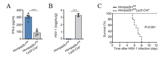 除了體外實(shí)驗(yàn),研究人員還構(gòu)建了Hnrnpa2b1骨髓細(xì)胞特異性敲除小鼠(Hnrnpa2b1fl/fl;Lyz2-Cre+/–),發(fā)現(xiàn)在被HSV-1感染后,其原發(fā)性腹膜巨噬細(xì)胞(PMs)中IFN-β的轉(zhuǎn)錄水平及分泌能力都顯著下降,同時(shí)伴隨著腦內(nèi)更高的病毒滴度及其更高的死亡率(Fig.1)。