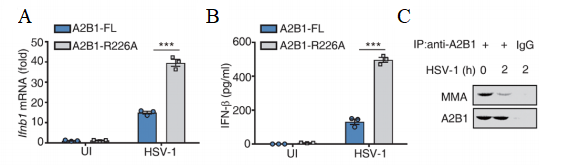 早前研究認(rèn)為,巨噬細(xì)胞被HSV-1感染后,hnRNPA2B1的R226位點(diǎn)會(huì)發(fā)生去甲基化。而在Hnrnpa2b1敲除的RAW264.7細(xì)胞中過(guò)表達(dá)hnRNPA2B1-R226A相對(duì)于過(guò)表達(dá)野生型hnRNPA2B1來(lái)講,在經(jīng)過(guò)HSV-1感染后,前者(hnRNPA2B1-R226A是非甲基化狀態(tài))IFN-β的mRNA水平和蛋白水平將有更大幅度的上升(Fig.2),這就意味著hnRNPA2B1在Arg226位點(diǎn)的去甲基化在整個(gè)免疫反應(yīng)中有重要作用,且確定了去甲基化過(guò)程與去甲基化酶JMJD6有關(guān)。
