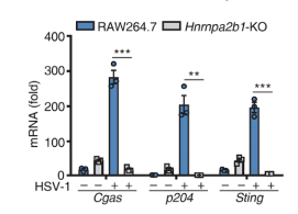 在Hnrnpa2b1-KO的AW264.7細(xì)胞中,被HSV-1感染后,干擾素Ifnb1的表達(dá)明顯降低,且同時(shí)HSV-1的復(fù)制能力增強(qiáng)。