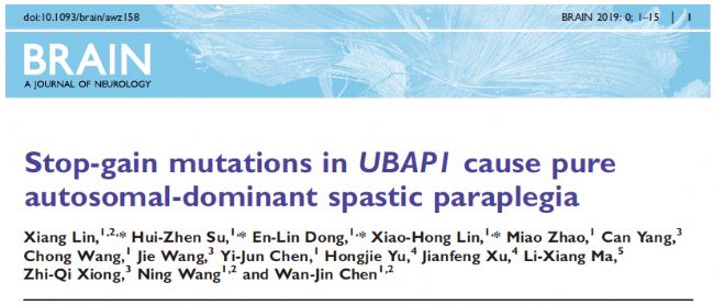 2019年6月15日,南模生物斑馬魚平臺與福建醫(yī)科大學附屬第一醫(yī)院神經內科陳萬金與王檸教授團隊合作在全球臨床神經學頂級雜志《Brain》在線發(fā)表了題為“Stop-gain mutations in UBAP1 cause pure autosomal-dominant spastic paraplegia”的研究長文。