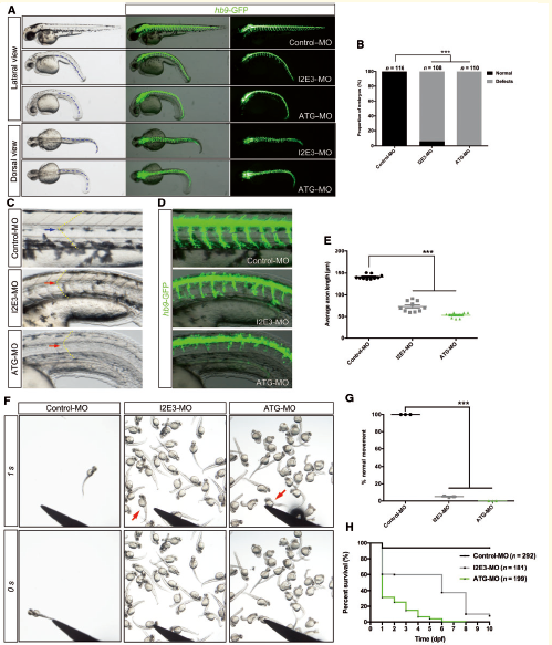 作者首先在南模生物構建了ubap1基因的MO斑馬魚模型,I2E3-MO和ATG-MO。ubap1基因knockdown后,斑馬魚的形態(tài)異常,幼體運動能力減弱以及壽命縮短。