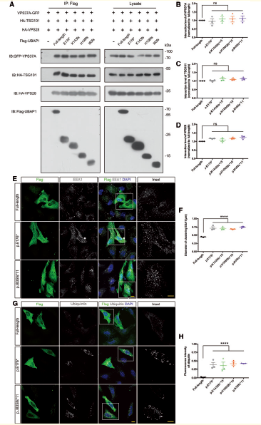 作者接下來探究分子機制。以前的研究表明,UBAP1可以通過UMA 功能域和ESCRT-1復合物結合。作者通過CO-IP(蛋白質免疫共沉淀),發(fā)現截斷的UBAP1仍然可以和ESCRT-1復合物結合,且結合能力沒有降低。
