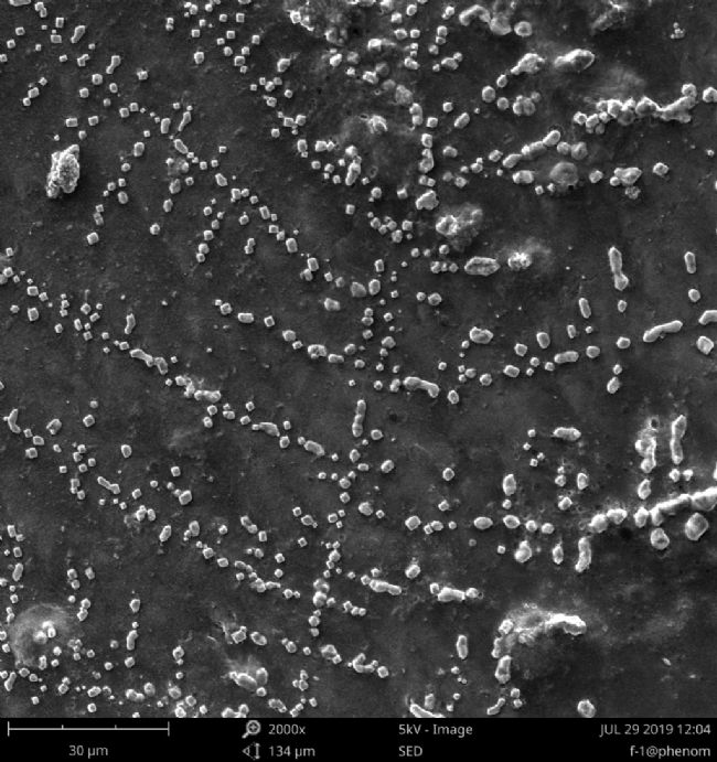 SEM 樣品制備過程中,也需要防止唾液污染樣品,必要時配戴口罩。當操作員對著樣品說話或打噴嚏,會將唾液濺射到樣品表面,待唾液干燥后,會在樣品表面形成明顯的結晶。