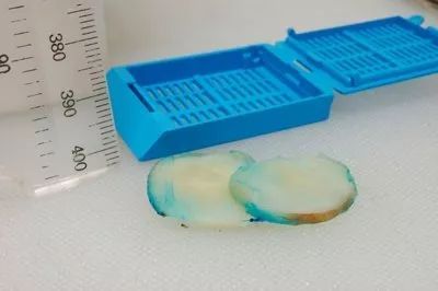 圖示為腫塊脫水切片薄(2-3mm)且均一。此切片能進行有效的脫水并且易于切成蠟片。