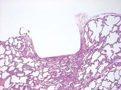 H&E染色的肺:使用鉗子隨意夾取組織,引起組織局部有明顯的損傷。新鮮的或者固定不充分的組織很容易受損,即使是一些固定充分的組織也會因隨意夾取而受損。